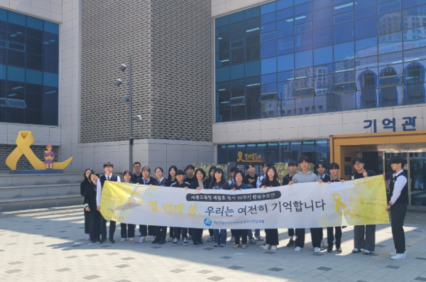 [충청뉴스 최형순 기자] 세종특별자치시교육청(교육감 최교진, 이하 세종시교육청) 세종학생회연합회 ‘한울’ 학생 등 30여 명이 13일 안산의 4.16 민주시민교육원 기억 교실, 단원고등학교 추념비, 4.16기억전시관 등을 방문하여 추모행사를 가졌다.