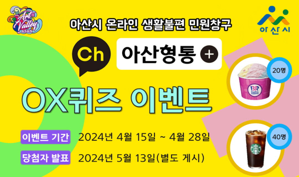 [충청뉴스 박동혁 기자] 충남 아산시는 카카오톡 생활불편 민원창구인 ‘아산형통’ 개설 1주년을 맞아 오는 28일까지 O·X 퀴즈 이벤트를 진행한다고 15일 밝혔다.