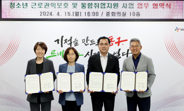 협약에는 대전 동구, 대전지방고용노동청, 대전청소년위캔센터, 대전시학교밖청소년지원센터가 참여했으며, 각 기관은 전문성을 활용해 청소년들의 부당한 근로 침해를 방지하고 안정적인 사회 진출 적응을 지원하기 위한 체계 구축에 힘을 모으기로 약속했다.