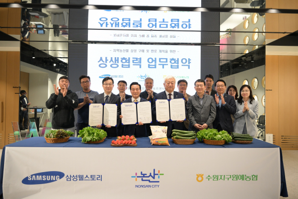 [충청뉴스 논산 = 조홍기 기자] 논산시(시장 백성현)의 농특산물 유통망ㆍ판로 개척 노력이 굴지 대기업과의 상생협력으로 이어지며 혁혁한 성과를 낳고 있다. 논산시는 더 잘사는 농촌, 지속가능한 농업발전을 위해 삼성웰스토리(사장 정해린), 수원지구원예농협(조합장 이용학)(이하 수원원협)과 손잡았다.