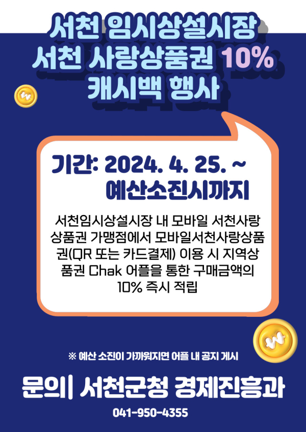 서천임시상설시장 내 서천사랑상품권 가맹점에서 모바일 서천사랑상품권(QR 및 카드 결제)으로 결제하면 즉시 10% 캐시백을 지역상품권Chak 어플에서 지급받을 수 있다.