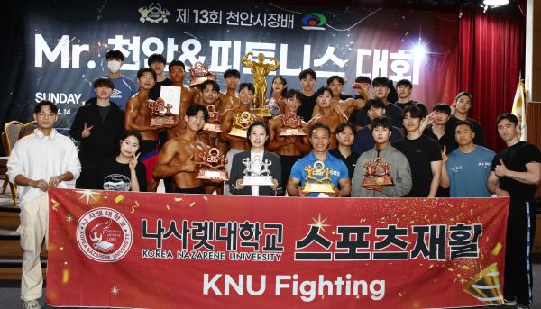 18일 나사렛대에 따르면 최근 천안상록리조트에서 열린 ‘제13회 천안시장배 Mr.천안 & 피트니스 대회’에 참가한 재학생들이 우수한 성적을 거뒀다.