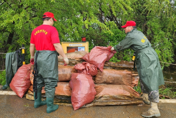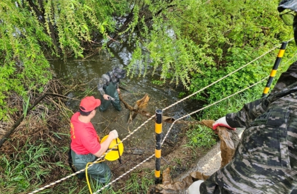 전우회원들은 비가 오는 궂은 날씨에도 불구하고 폐사한 물고기 등 호수 내 각종 부유물과 오염물질 수거에 구슬땀을 흘렸다.