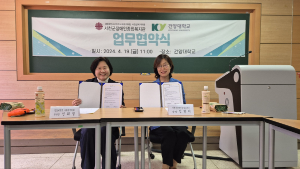 [충청뉴스 서천 = 조홍기 기자] 서천군장애인종합복지관(관장 임향이)과 건양대학교(총장 김용하, 이하 건양대) 사회복지학과(학과장 신희정)이 건양대학교 인문학과에서 양 기관의 상호교류 및 협력관계 유지를 위한 협약을 체결했다.