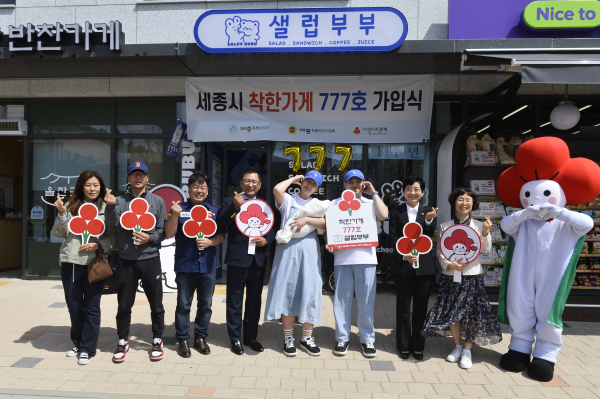 세종사회복지공동모금회(회장 박상혁, 이하 세종모금회)는 23일 시 반곡동에서 샐럽부부 남편 권용진, 아내 김주혜, 딸 권구름양과 이순열 세종시의회 의장, 박상혁 세종모금회 회장, 서영석 ㈜세종시 한글 빵 대표 등이 참석한 가운데 ‘세종시 착한가게 샐럽부부 777호 가입식’을 가졌다.