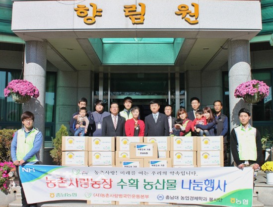 농협충남지역본부(본부장 임승한)는 19일 농촌사랑봉사단원(충남대 농경제학과) 및 지역본부 직원 30여명은 공주시 반포면 온천리에 조성된 '농촌사랑 나눔 주말농장'에서 정성을 들여 지은 고구마를 수확하고 금산군 추부면 소재한 향림원 어린이들에게 고구마 300kg(10kg 30박스)를 전달했다.