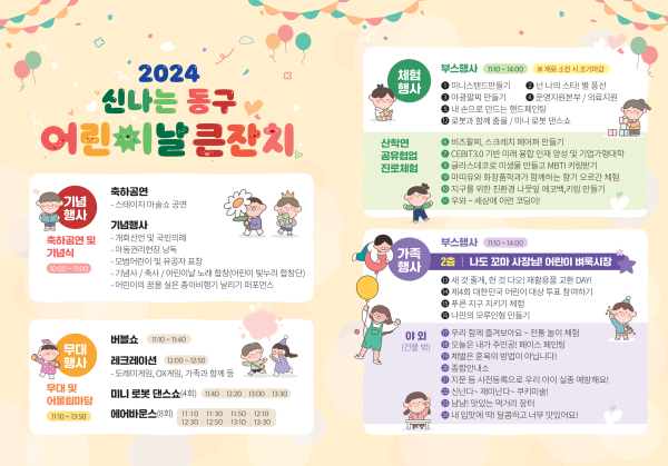 [충청뉴스 박영환 기자] 대전 동구(구청장 박희조)는 5월 5일 10시 대전대학교 맥센터 실내체육관에서 제102회 어린이날을 맞아 “내일의 소중한 꿈을 함께 키우는, 신나는 동구 어린이날 큰잔치”를 개최한다고 29일 밝혔다.