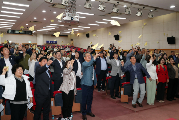 30일 구청 대강당에서 주민자치회 위원 160명을 대상으로 역량강화 교육을 실시한 가운데, 정용래 유성구청장(왼쪽에서 네 번째)과 참석자들이 퍼포먼스를 하고 있다.