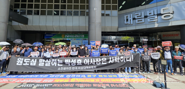 장수현 위원장은 “박성효 이사장은 대전시장 재임 시 중앙데파트와 홍명상가를 철거해 원도심 상권을 말살한 장본인”이라며 “아집행정으로 중구민을 우롱하고 있다. 즉각 사퇴하라”고 규탄했다.