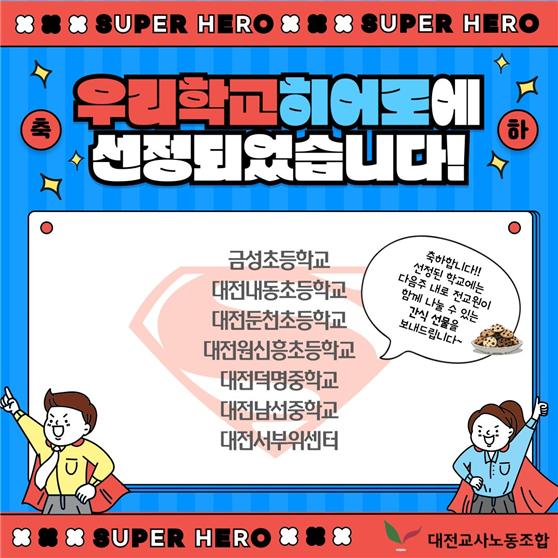 총 33개교에서 45분의 히어로가 추천됐고 최종 선정된 7개교(금성초등학교, 대전내동초등학교, 대전둔천초등학교, 대전원신흥초등학교, 대전덕명중학교, 대전남선중학교, 대전서부위센터)에는 전교원이 함께 나눌 수 있는 선물을 전달했다.
