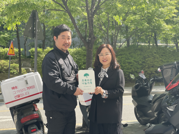 박미애 본부장(우), 배달요 세종지점에 ‘초록우산 나눔가게’ 현판을 전달하고 있다.