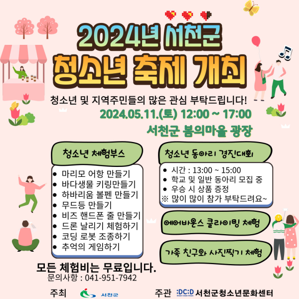[충청뉴스 서천 = 조홍기 기자] 서천군청소년문화센터에서는 5월 청소년의 달을 맞아 오는 11일(토) 오후 12시부터 오후 5시까지 ‘봄의마을 광장’에서 ‘서천군 청소년 축제’를 개최한다.
