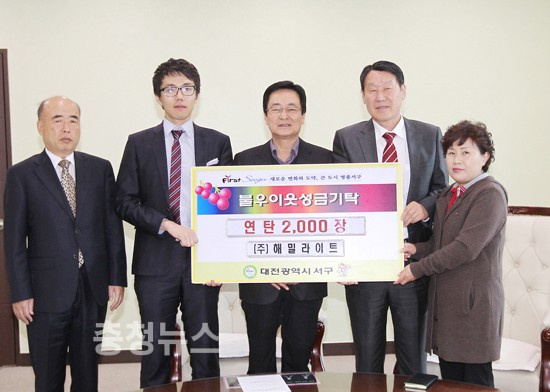 대전광역시 서구(구청장 박환용)는 24일 (주)해밀라이트(이범구 대표이사)로부터 서구 사례관리대상자 및 복지만두레 결연대상자 10세대에게 따뜻한 겨울을 지낼 수 있도록 연탄 2,000장(1,600만원 상당)을 기탁 받았다.