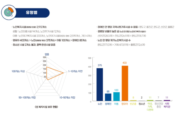 섬 지역은 육지는 물론 일반 농산어촌 지역에 비해서도 노인, 장애인, 빈곤층 비율이 높게 나타나는 등 복지수요가 높은 데 반해, 복지자원 공급은 가장 열악한 지역으로 꼽힌다.