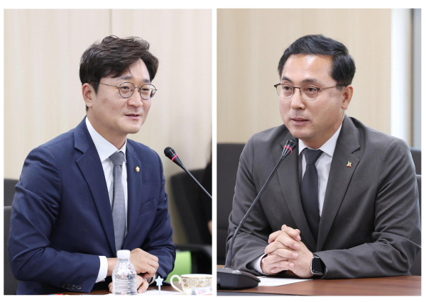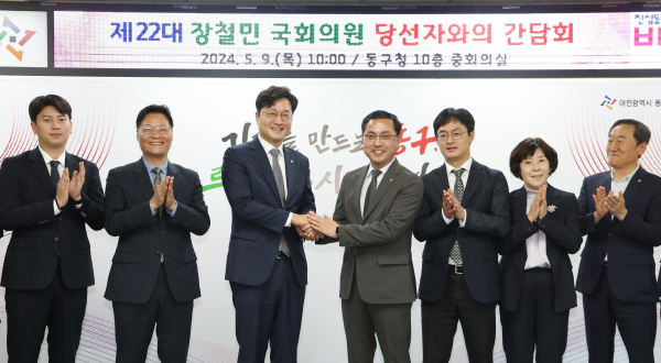 [충청뉴스 박영환 기자] 박희조 동구청장이 9일 동구청 중회의실에서 지난 22대 국회의원선거에서 재선에 성공한 장철민 국회의원과 간담회를 가졌다. 각종 현안 사업이 담긴 구정 홍보영상을 시청하며 진행된 이날 간담회에서 박 청장과 장 의원은 동구 현안 사업인 도심융합특구, 교육분야, 재정분야, 대청호 규제완화 분야 등에 의견을 모으며 초당적 협력을 약속했다.