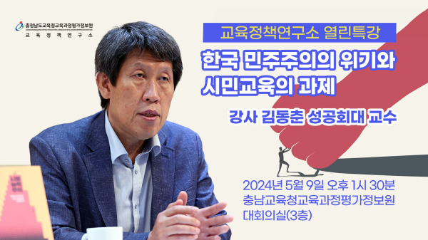 이영주 교육정책연구소장은 “좋은 강연을 해준 김동춘 교수와 많은 관심을 갖고 참여한 교육청 가족들에게 고마운 마음을 전한다”며 “앞으로도 충남교육공동체 누구나 교육담론의 주인공으로 참여할 수 있는 기회를 열어, 모든 아이가 행복한 지속가능한 교육의 큰 그림을 함께 그려나가도록 노력하겠다”고 밝혔다.