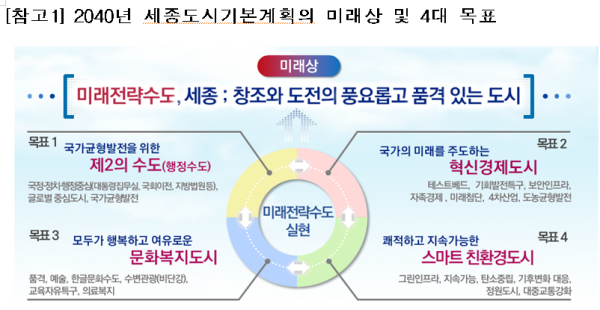 먼저 2040년 도시기본계획의 미래상 실현을 위한 4대 목표는 ▲국가균형발전을 위한 ‘제2의 수도(행정수도)’ ▲국가의 미래를 주도하는 ‘혁신경제도시’ ▲모두가 행복하고 여유로운 ‘문화복지도시’ ▲쾌적하고 지속가능한 ‘스마트 친환경도시’로 제시됐다.