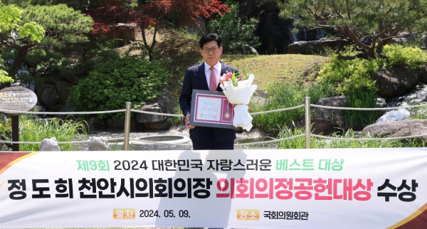 [충청뉴스 박동혁 기자] 정도희 천안시의회 의장은 지난 9일 국회의원회관 소회의실에서 열린 ‘제9회 2024 대한민국 자랑스러운 베스트대상’ 시상식에서 의회의정공헌대상을 받았다.