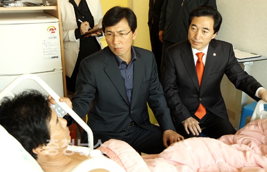 안희정 충청남도지사는 26일 서울 성모병원에 입원 치료 중인 국응복(58‧충남 태안) 서해안유류피해총연합회장을 찾아 위로의 뜻을 전했다.