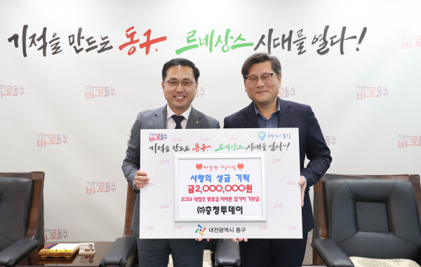 이날 기탁식에는 박희조 동구청장, 박신용 충청투데이 대표이사 등이 참석해 자리를 빛냈으며, 기부금은 동구의 대표 복지브랜드인 ‘천사의 손길’을 통해 어려운 이웃들에게 전달될 예정이다.