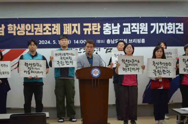한편, 충남학생인권조례 폐지를 규탄하는 충남지역 교직원 860명 일동은 도청 프레스센터에서 기자회견을 열고 “반교육적, 반역사적, 반인권적 행위를 부끄럼 없이 자행한 충남도의회 국민의힘 도의원들을 규탄한다”고 목소리를 높였다.