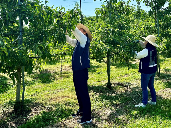 충남교육청 교직원들이 예산군 소재 과수원 농가를 방문하여 일손을 돕고 있다