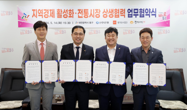 [충청뉴스 박영환 기자] 대전 동구(구청장 박희조)는 신한은행 땡겨요사업단 및 대전충남본부, 중앙시장활성화구역상인회와 함께 신한은행 상생배달앱 ‘땡겨요’를 활용한 전통시장 상생협력 업무협약을 맺었다고 14일 밝혔다.