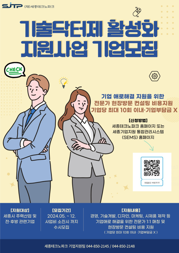 [충청뉴스 최형순 기자] (재)세종테크노파크가 세종시 중소기업의 기술(R&D), 경영, 규제 등 애로 해결을 지원하는 ‘2024년 기술닥터제 활성화 지원사업’에 참여할 기업을 모집한다.