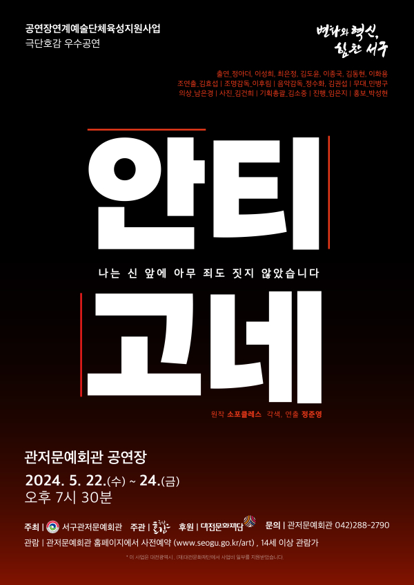 이번 공연은 고전 명작으로 널리 알려진 소포클레스의 비극 안티고네로, 5월 22일부터 24일까지 관저문예회관에서 관람할 수 있다. 특히, 정준영 대표의 연출, 각색을 통해 극단 호감만의 색깔로 재탄생해 선보인다.