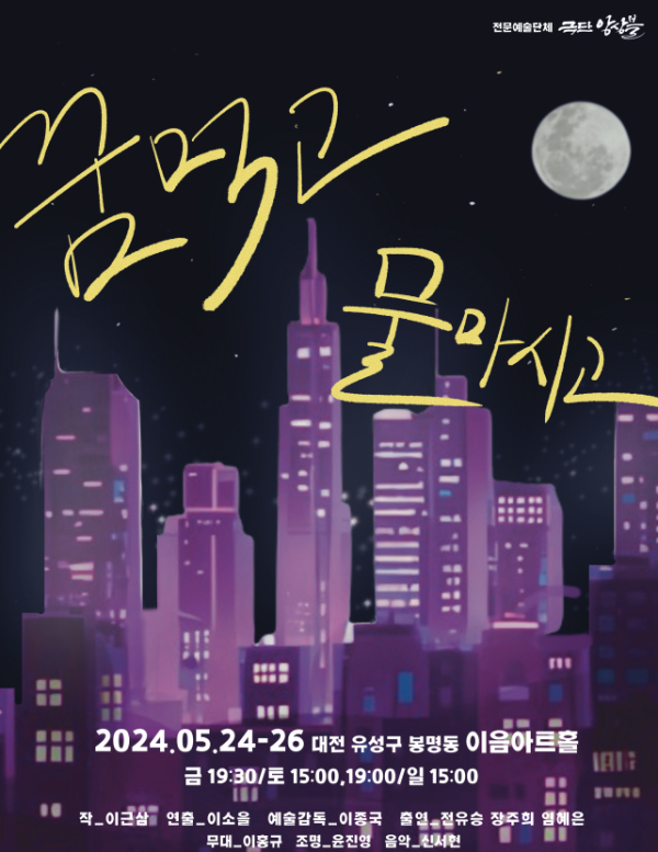 [충청뉴스 박영환 기자] 대전문화재단 2024년 중견예술인지원사업 단체 극단 앙상블이 <꿈먹고 물마시고> 뮤지컬 공연을 5월 24일부터 26일까지 이음아트홀(대전 유성구 도안대로 591)에서 개최한다.