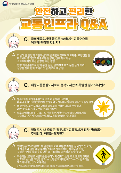 행복청은 매년 정기적으로 교통량 조사를 실시하여 지정체가 심한 주요 도로의 신호최적화, 차로운영 조정, 교통안전시설 설치 등 다양한 개선 대책을 마련하여 시행하고 있으며, 이에 따라 평균 지체시간이 20~40% 감소하는 효과가 나타난 것으로 분석되었다.