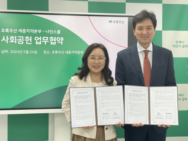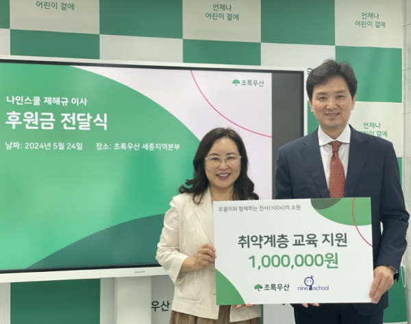 [충청뉴스 최형순 기자] 초록우산 세종지역본부(본부장 박미애)는 24일 초중고 온라인 교육 ‘나인스쿨’의 제해규 이사가 국내 저소득가정 아동의 교육 지원을 위한 후원금 1 백만원을 전달하고 교육지원을 위한 사회공헌 협약을 체결했다.
