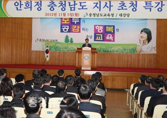충남교육청(교육감 김종성)과 충남도(도지사 안희정)의 두 수장이 지역사회 발전과 기관간 업무 이해를 돕기 위해 지난 10월 2일과 11월 5일 직원들을 대상으로 교차 특강을 했다.