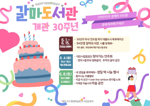 도서관은 6월 1일부터 15일까지 ▲30년간 사랑받은 최다 대출 도서 전시 ▲94년생 갈마도서관, 퀴즈풀기 자료실 이벤트를 운영하고, 6월 4일 대전시립합창단과 함께하는 찾아가는 연주회를 시작으로 6월 8일 지역주민의 문화 향유를 위한 ▲흥이 나는 우쿨렐레 ▲소프라노&테너의 아름다운 노래 ▲지혜준 마술사 공연과 ▲생일 축하 떡 나눔 이벤트 등으로 30주년을 기념할 예정이다.