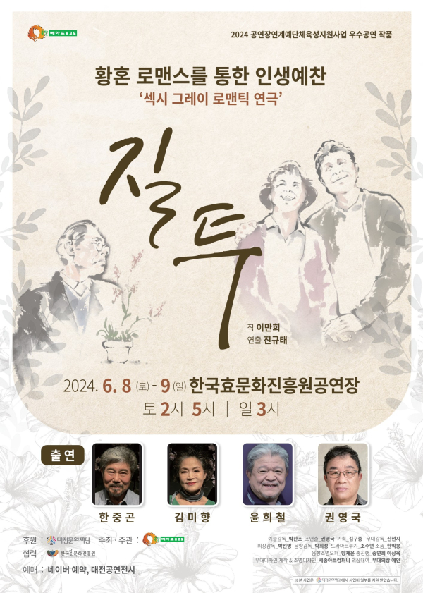 [충청뉴스 박영환 기자] 대전문화재단(대표이사 백춘희)이 지원하는 공연장연계예술단체육성지원사업에 선정된 극단 떼아뜨르 고도가 한국효문화진흥원 대강당에서 황혼 로맨스를 다룬 공연 <질투>를 개최한다.