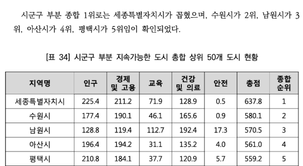 - 세종시, 총점 637.8점 획득…도시 지속가능성 종합 1위 기록