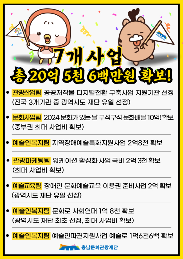 [충청뉴스 권상재 기자] 충남문화관광재단(이하 재단)이 올해 문화체육관광부 등이 주관하는 각종 공모사업에 7개 사업이 잇달아 선정되면서 20억 원의 사업비를 확보, 도내 관광 활성화 및 문예진흥사업이 더욱 탄력을 받을 전망이다.
