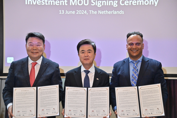 김 지사는 13일(이하 현지시각) 네덜란드 노르트브라반트주 컨퍼런티에센트럼 호텔 보벤동크에서 애비 마하라지 뉴콜드 최고운영책임자, 오성환 당진시장과 투자양해각서를 체결했다.