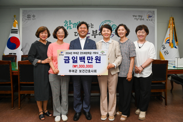 [충청뉴스 부여 = 조홍기 기자] 부여군 보건간호사회(회장 진미영)은 지난 14일 굿뜨래장학금 100만 원을 부여굿뜨래장학회(이사장 박정현)에 기탁하였다.