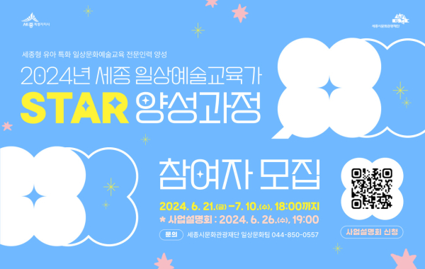 [충청뉴스 최형순 기자] 세종시문화관광재단(대표이사 박영국)은‘2024년 세종 일상예술교육가(STAR) 양성과정’참여자를 모집한다.