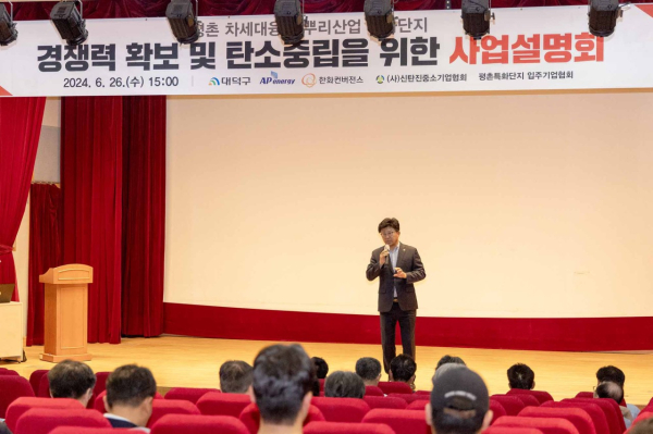 [충청뉴스 박영환 기자] 대전 대덕구는 지난 26일 신탄진도서관 다목적홀에서 평촌특화단지 입주기업협회 및 (사)신탄진 중소기업협회 업체를 대상으로 RE100 사업설명회를 개최했다고 밝혔다.