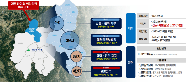 이번에 특화단지로 지정된 산업단지는 총 4개 단지 891만㎡(약 270만 평) 규모다. 이미 조성된 2개 단지(신동·둔곡, 대덕테크노밸리)와 신규 조성 예정인 2개 단지(탑립·전민, 원촌첨단바이오메디컬지구)이다.