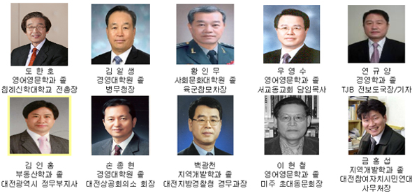 매년 사회 각 분야에서 모교의 명예를 높인 동문에게 수여하는 이 상의 올해 수상자는 ▲도한호 전 침심대 총장(영문학과) ▲김일생 병무청장(경영대학원) ▲황인무 육군참모차장(사회문화대학원) ▲김인홍 대전시 정무부시장(사회문화대학원) ▲손종현 대전상공회의소 회장(경영대학원) ▲백광천 대전경찰청 경무과장(지역개발학과) ▲우영수 서교동교회 담임목사(영문학과) ▲연규양 TJB 전 보도국장(경영학과) ▲금홍섭 대전참여자치시민연대 사무처장(지역개발학과) ▲이헌철 미주 초대동문회장(영문학과) 등이다.