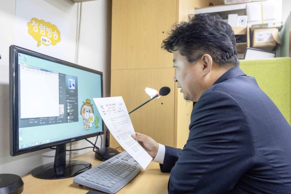 최충규 대덕구청장이 28일 ‘청렴 방송 릴레이 행사’ 첫 주자로 나서서 청렴 방송을 진행하고 있다.