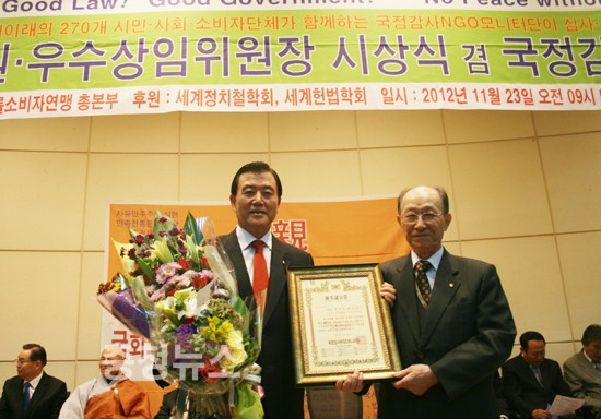 새누리당 홍문표 국회의원(충남 예산·홍성)은 23일 오전 국회 헌정기념관에서 국정감사NGO모니터단(상임공동단장: 법률소비자연맹 총재 김대인)으로부터 2012년도 국정감사 우수 국회의원상을 수상했다.