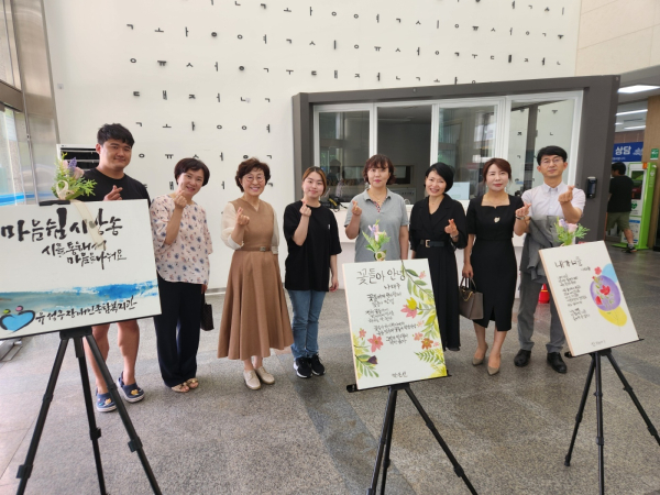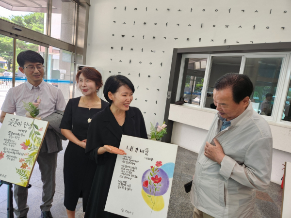 [충청뉴스 최형순 기자] 유성구장애인종합복지관(관장 김영근) 7명의 장애인들이 애송하는 시 작품 7점이 1일 유성구청 1층 로비에 게시돼 잔잔한 감동을 주고 있다.