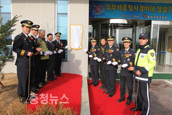 충남지방경찰청(청장 치안감 윤철규)에서는 금년 말까지 국무총리실 등 12개 기관이 이전함에 따라 정부기능의 안정적 정착을 위해 23일 오후, 세종시 어진동 소재 세종청사경비대 신청사에서 내빈 등 200여명이 참석한 가운데 창설식을 갖고 청사경비대 업무를 시작했다.