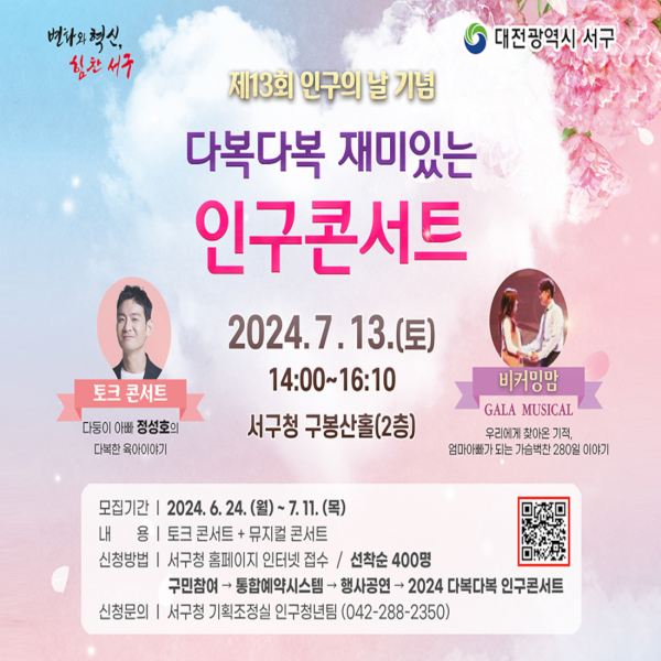 [충청뉴스 박영환 기자] 대전 서구가 오는 13일 구청 2층 구봉산홀에서 인구 문제에 대한 인식을 높이기 위해 '다복다복 재미있는 인구콘서트'를 개최한다고 3일 밝혔다.