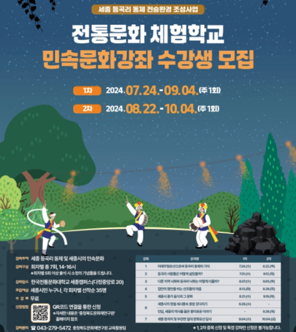[충청뉴스 최형순 기자] 세종특별자치시(시장 최민호)가 ‘전통문화체험학교 민속문화강좌’에 참여할 수강생을 내달 21일까지 선착순 모집한다.