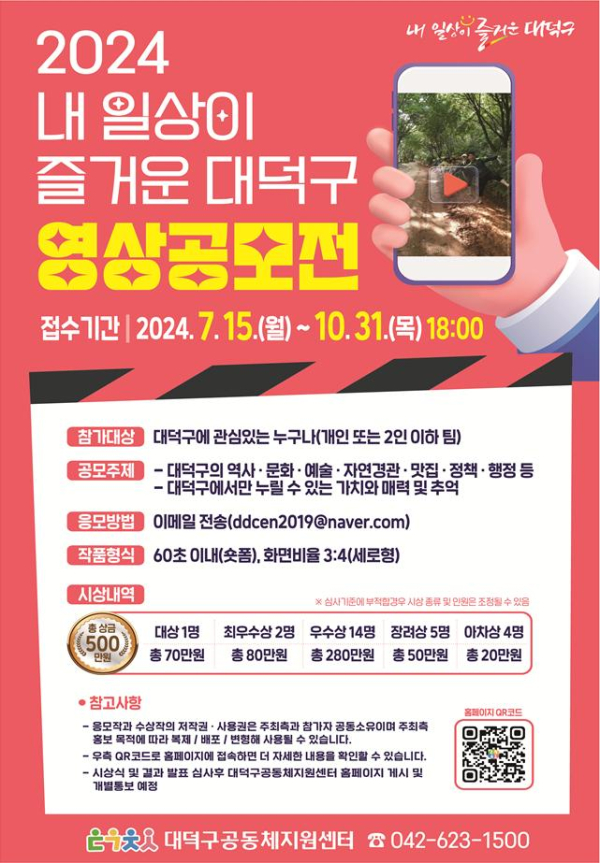 대덕구의 역사, 문화, 관광, 환경, 맛집 기행 등의 주제로 구에서만 누릴 수 있는 지역의 특색과 매력을 담은 1분 이내의 영상을 제작하면 된다.